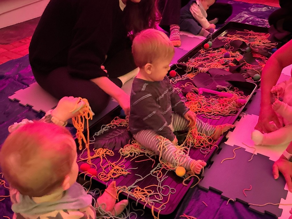 Encouraging movement, grasping, and texture exploration for sitting babies. Interactive play stations with varied materials, music, and movement activities.